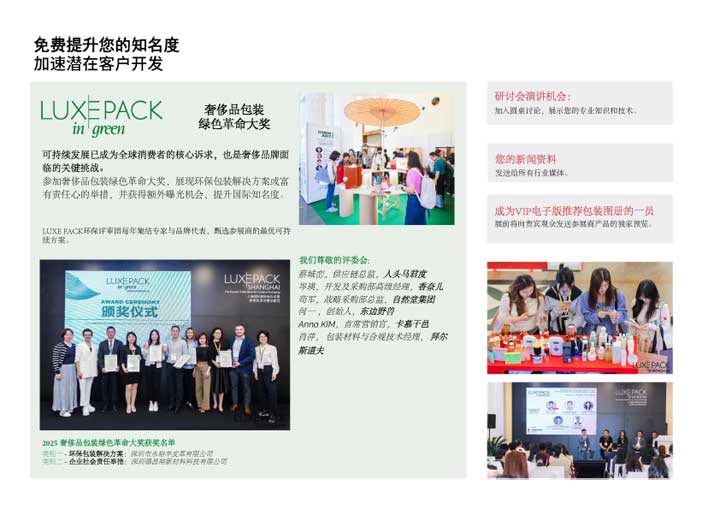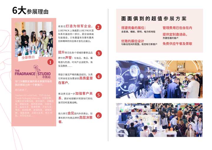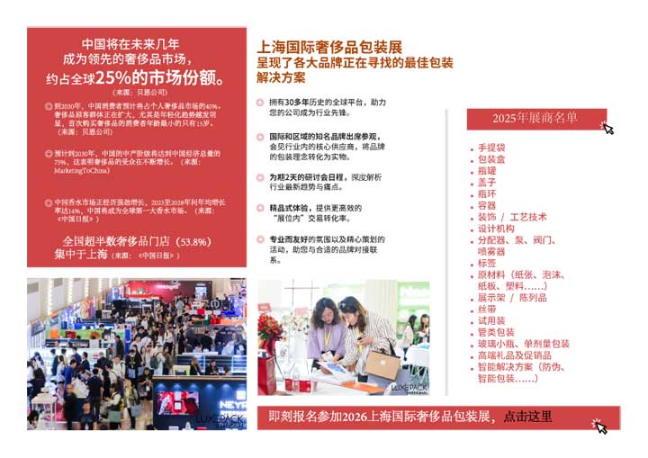 ![]() 参展机遇: ① 上海国际奢侈品包装展是 LUXE PACK国际系列展会的一部分,是全球高端包装展会,只有最富有创意和最具创新精神的供应商才会在此展出。参与上海国际奢侈品包装展,即加入覆盖摩纳哥、纽约等全球核心市场的高端社群,凭借卓越创意与顶级定位塑造国际品牌影响力。 ② 高性价比一站式展位服务解决方案,让展商轻松参展。搭建完备的展位、优雅的展位设计与融洽无间的氛围带来精品式体验,提供更高效的“展位内”交易转化率。精心策划的活动,助力展商与品牌对接联系。 ③ 深度推动客户关系,理解并预测他们的包装项目和发展战略。展商将有机会获邀参与官方研讨会,与国际大师及品牌领袖同台交流,获取行业前沿资讯,洞悉全球高端品牌与中国奢侈品消费者的需求动向。 ④ 得益于展览严格的甄选规则,为贵司带来有实际需求的高质量潜在客户,并助力展商会见国内外的商业、创意和新兴电商品牌的高层决策者,深度对接全球及亚洲的奢侈品品牌的高层,如来自LVMH、珀莱雅、东边野兽、斐乐、卡慕、人头马君度、天梭、香奈儿、自然堂、资生堂等海内外跨行业高端品牌,其中85%的观众为决策层。 ⑤ 参与久负盛名的“奢侈品包装绿色革命大奖”,向顶级品牌组成的评审团展示您的环保包装方案或可持续举措,收获更高曝光与国际认可。大奖评委会每年集结专家与品牌代表,甄选参展商的最优可持续方案。 ⑥ 展会核心位置特别设立专属的“寻氛站”展区,汇聚创意供应商、独家工作坊及品牌精品,深入促进商业交流,多层次增强企业曝光。据中国日报报道,中国香水市场正经历强劲增长,2023至2028年间年均增长率达14%,中国将成为全球第一大香水市场。