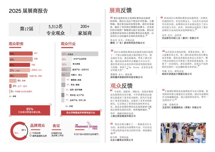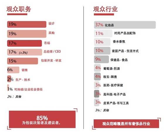 拥有近40年历史的全球平台,17年成功服务于中国创意包装行业,助力展商成为行业先锋。200多家领军企业展示他们在高端和奢侈品包装方面的创新成果,如Carré Basset、DAPY、Rissmann Group、TNT Global、创曦国际、法尚、海因兹玻璃、库尔兹集团、铭丰包装、品美裕、岱棱、雅雋、纯晶玻璃、巴比龙、正度、金雨等。 国际和区域的知名品牌出席参观,将包装理念转化为实物并深度解析行业最新趋势与痛点。往届演讲嘉宾及特邀观众出席的有联合利华、伽蓝、花王、华熙生物、娇韵诗、欧莱雅、欧舒丹、资生堂、珀莱雅、东边野兽、卡慕干邑、科蒂、历峰集团、毛戈平、人头马君度、保乐力加、五粮液、闻献、香奈儿、之禾、自然堂、冠生园、红牛、蒙牛、瑞士莲、星巴克、益海嘉里、金伯利钻石、周大福等知名品牌高管,并与参展企业展开深入交流与合作洽谈。